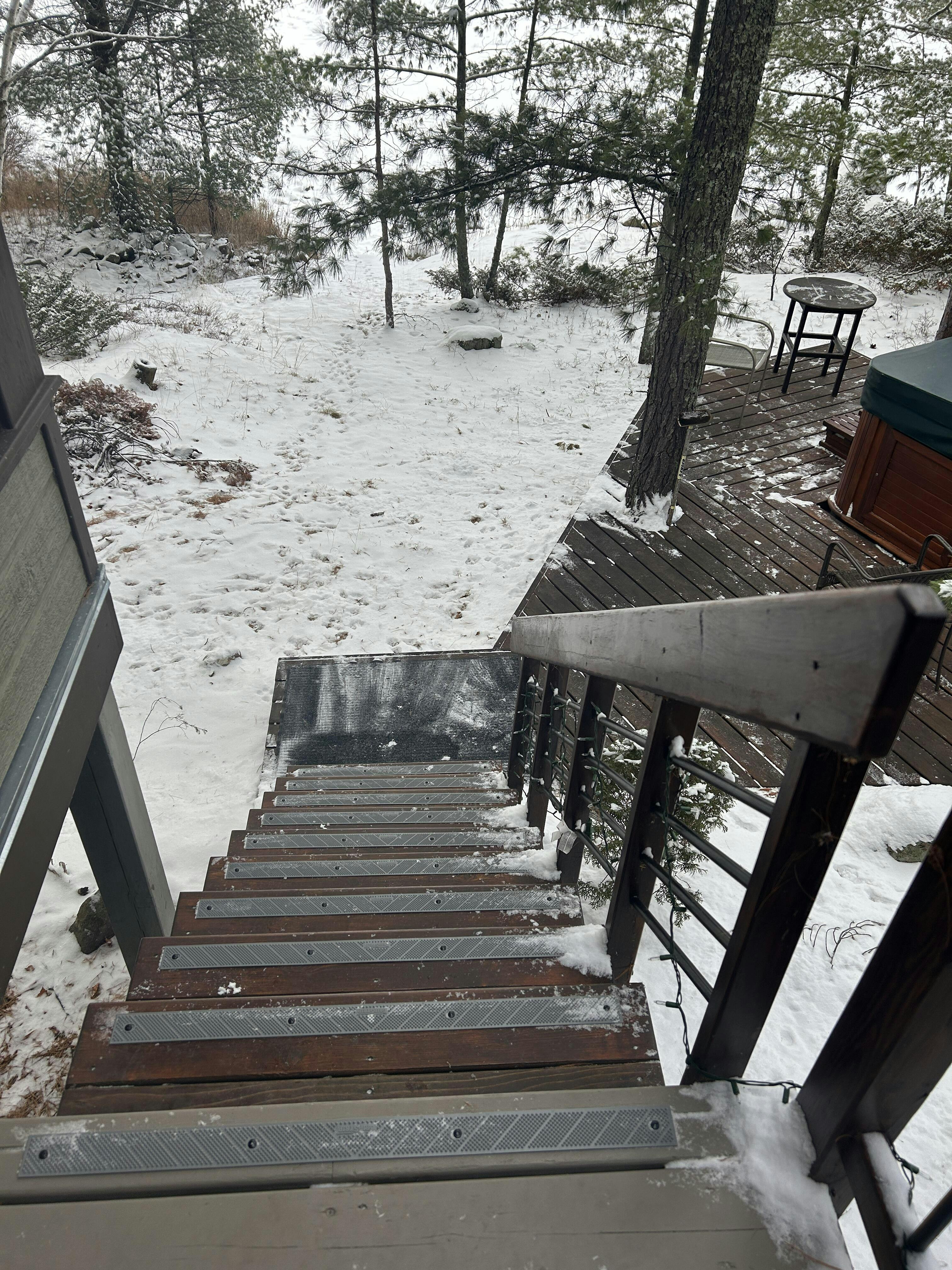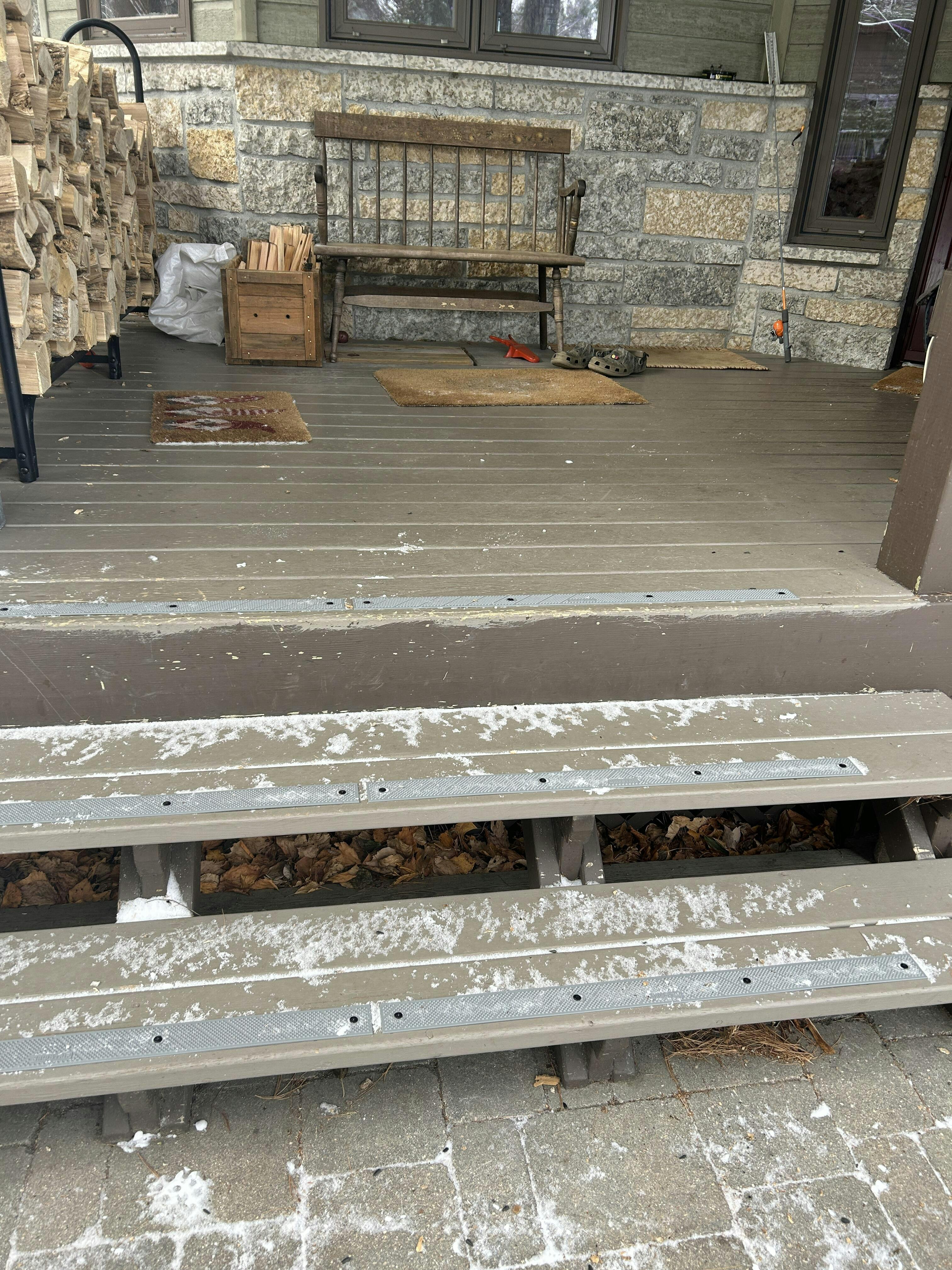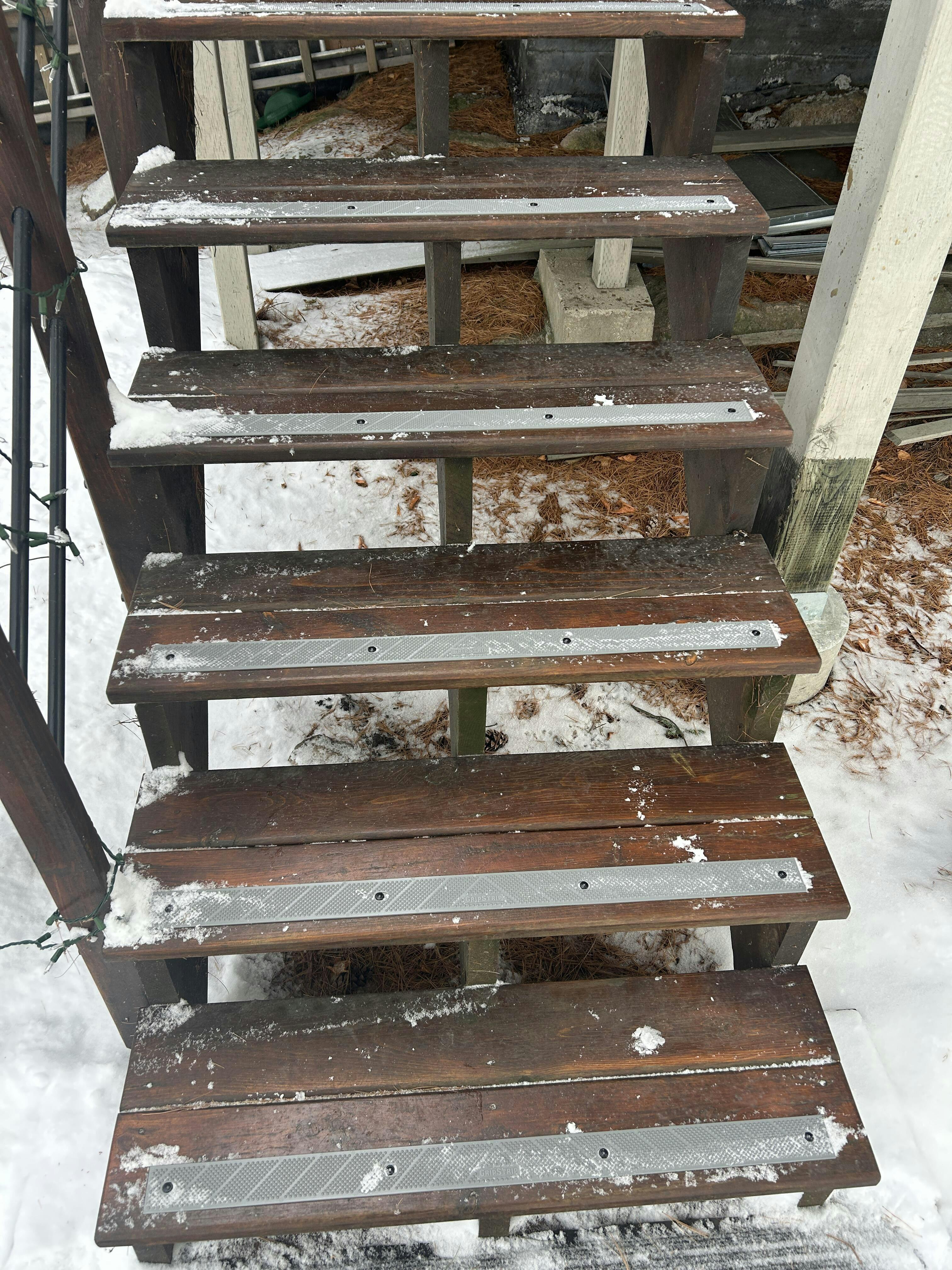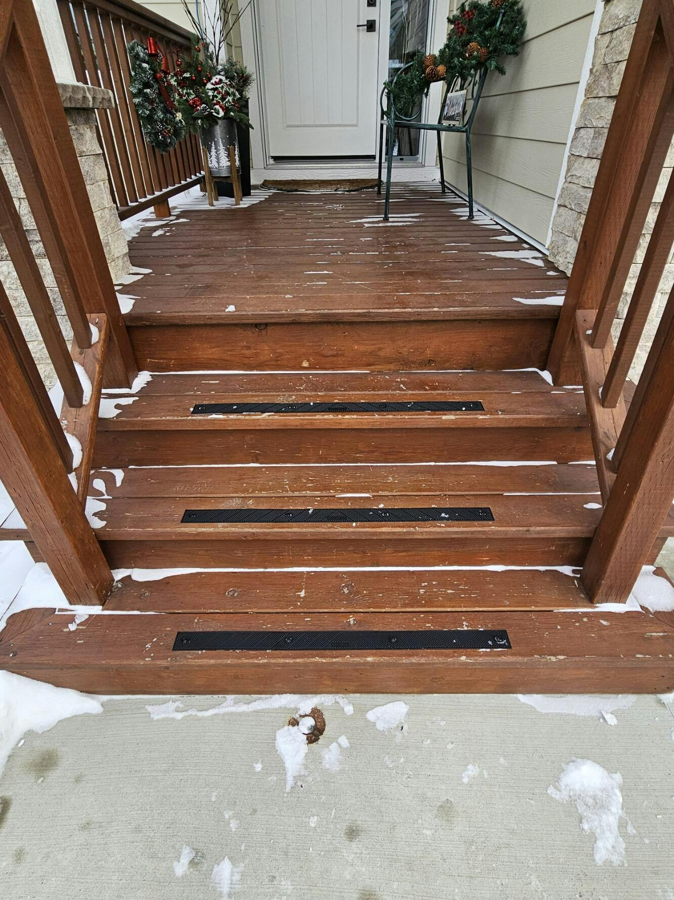 GripStrip are made of plastic and not an adhesive product but rather adhere to wood or other surfaces using provided screws. GripStrip are ideal for porches, separate entry stairs, deck, docks, ramps, scaffolding, boardwalks and more and may help prevent slips and falls by providing safer footing. *May be too aggressive for bare feet.